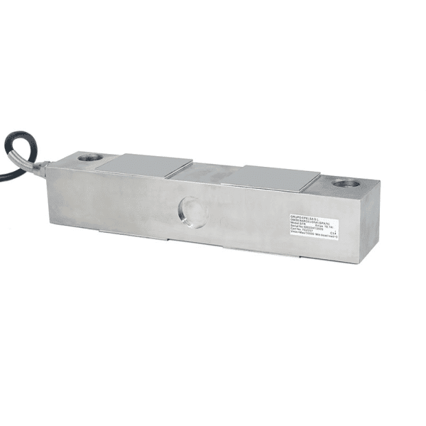 Célula de carga, com extensômetros encapsulados, trabalha em cisalhamento duplo.